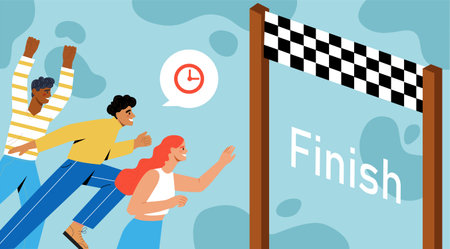 Group of diverse people running toward a finish line with a clock symbol above, flat graphic style on a blue abstract background. Concept of goal achievement. Vector illustration