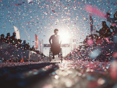 A teenager in a wheelchair crosses the finish line of a sports event while confetti is falling around. People cheer and celebrate in the background.