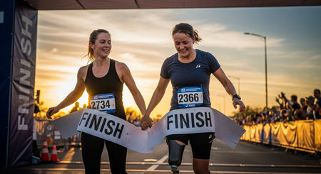 Athlete with prosthetic leg triumphantly crossing the marathon finish line, celebrating victory and inspiring determination among cheering spectators