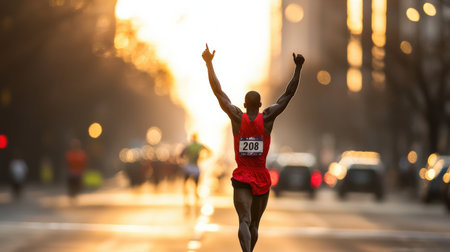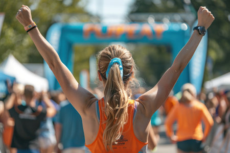 A dynamic shot of a runner crossing the finish line with their arms raised in triumph.
