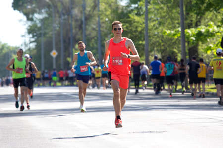 KHARKIV, UKRAINE - MAY 16, 2021: Kharkiv Half Marathon. Runners participating in a marathon run a distance on a city street