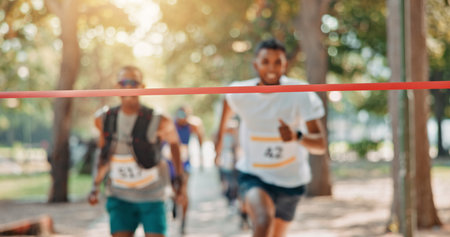 Running, marathon or people with finish line in park for charity event, health challenge or fitness. Speed, fundraising competition or fast runners in nature for outdoor workout, exercise or sports