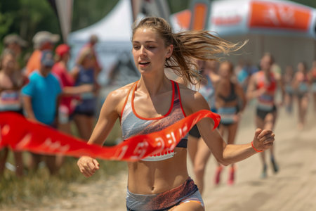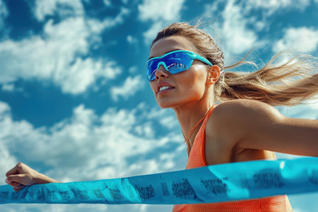 Strong female athlete winning a race and breaking the finish line