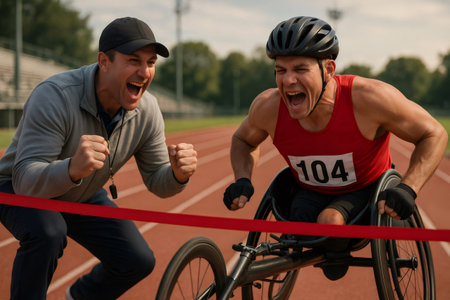 Paraplegic athlete crossing the finish line of a race in a wheelchair, with his coach cheering next to him
