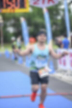 Runner finishing with raised arms. Happy athlete crossing finish line after marathon