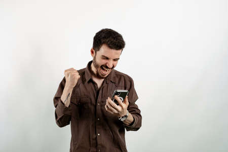 Caucasian young man wearing shirt posing isolated over white background being happy winning a bet in online sport gambling application on his mobile phone.