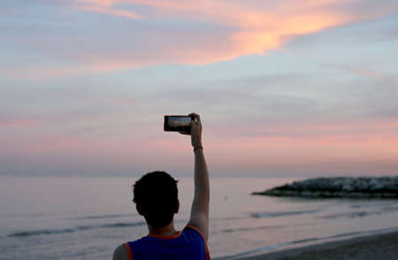 boy photographs the beautiful orange sunset by the sea with a smartphone