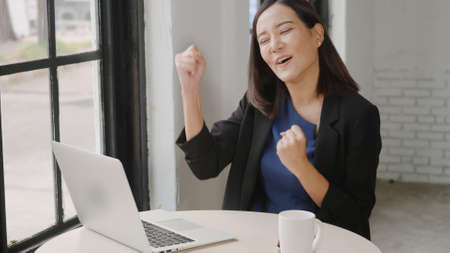Yes! Happy excited successful, Asian businesswoman smile workstation triumphing with raised hands with laptop computer, woman success project online winner