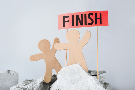 competition concept. Wooden human figures on stones and red sign with word Finish against gray background