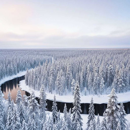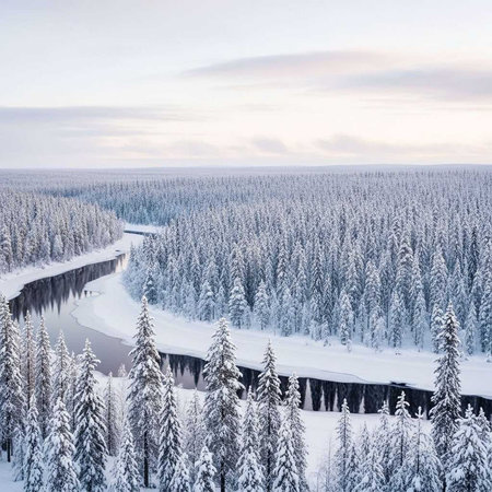 A serene winter landscape with a snow-covered forest and a winding river under a cloudy sky