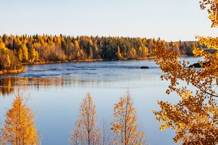 Lake in Karelia among larch trees, Russia. Beautiful autumn season landscape with river and forest stock photo