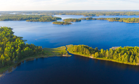Aerial view of blue lakes and green forests on a sunny summer day in Finland. drone photography