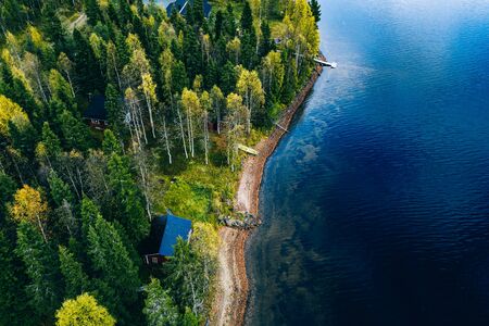 Aerial view of cottage in autumn colors forest by blue lake in rural fall in Finland