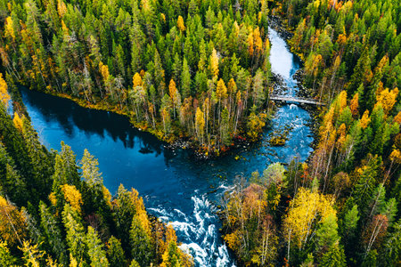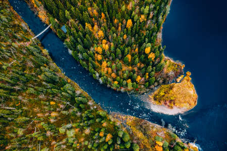 Aerial view of fast river flow through the rocks and colorful forest. Autumn in Finland, Oulanka national park.