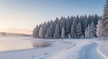 A serene winter landscape with a snow-covered forest and a frozen river under a cloudy sky