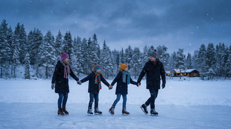 Family ice skating on a frozen lake in a snowy forest.