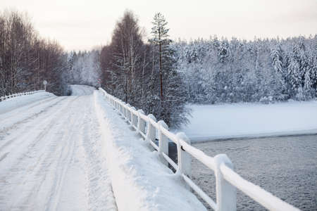 Snowy surface of empty country road on bridge across river, winter season