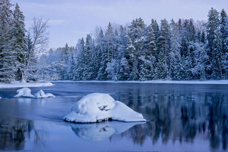 Dusk view of the forest river behind the snow