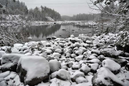 View of Vuoksi river and river banks in winter, Imatra, Finland