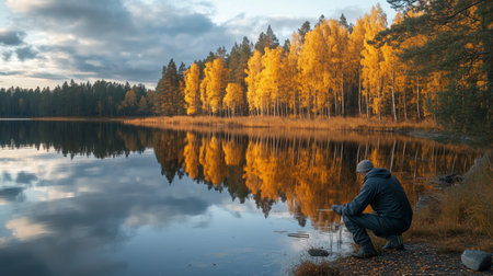 A peaceful autumn afternoon spent fishing by the tranquil lake surrounded by vibrant fall foliage in a serene wilderness area
