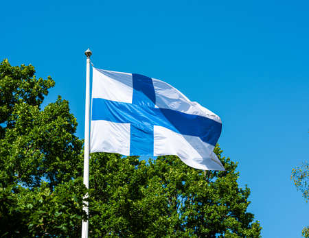 Finnish national flag on the wind against the blue sky