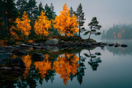 Autumn foliage creates a vibrant display along the calm lake, with reflections of colorful trees enhancing the peaceful atmosphere in a northern forest.