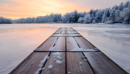 a long wooden dock sitting on top of a frozen lake