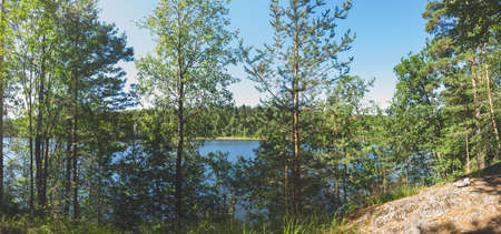 View of wild woods and idyllic lake in calm. North nature, taiga. Priozersk region Korela Russia, vertical, copy space