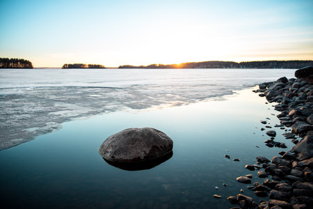 Sunrise on a rocky shore. Still water. Pine forest in the background. Northern landscape