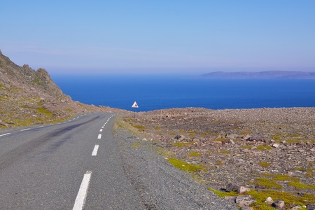 Road in Varanger, extreme north of Norway during summer with Barents Sea in the view