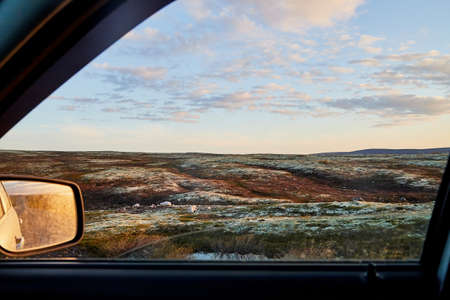 Tundra landscape with moss, glass and stouns in the north of Norway or Russia and blue sky with clouds frought window of a car in a summer, autumn or spring day