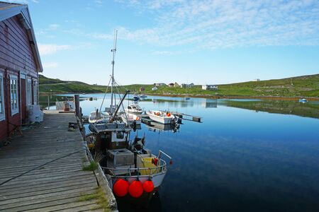The view at Ytrebukta bay with small boats and fishermen along the coastline of Porsangerfjorden in Norwegian Finnmark, close to the roar via the North Cape.