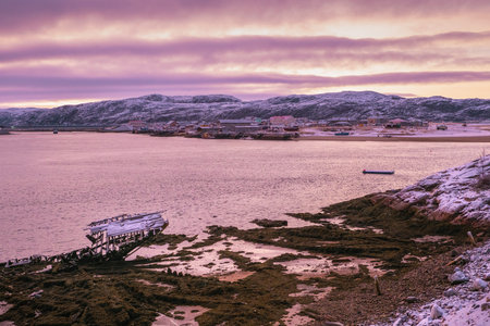 The polar village of Terebirka on a cloudy February day. Murmansk region, Russia