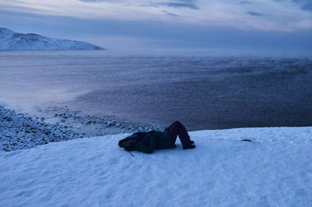 Traveler standing on icy shore near sea. tourist in a warm down jacket with a camera and a backpack is standing on the edge of the earth. The Arctic Ocean.