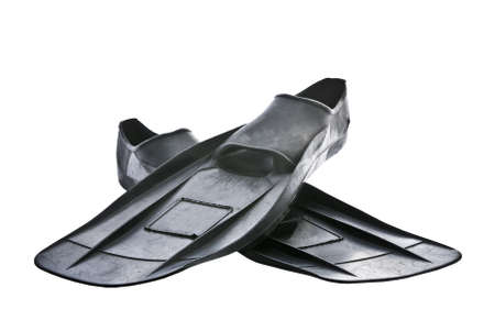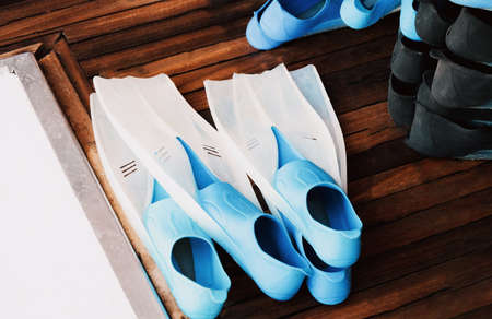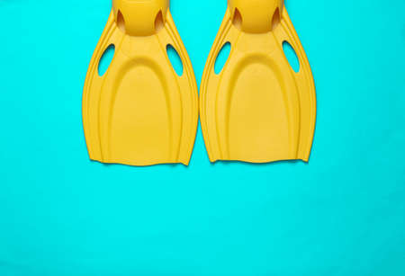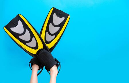 Fins for swimming in water crossed on a blue background with a place for an inscription. Feet in flippers on the background.