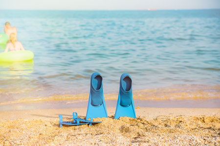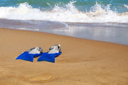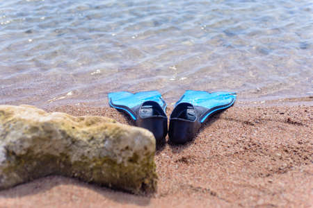 blue flippers on the sea in the sand with waves for swimming on vacation in travel