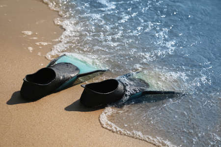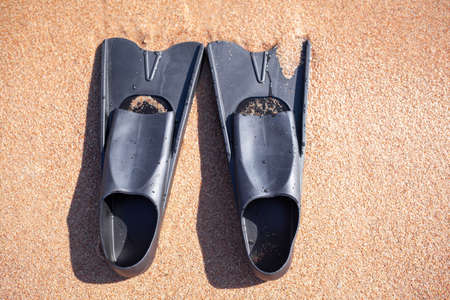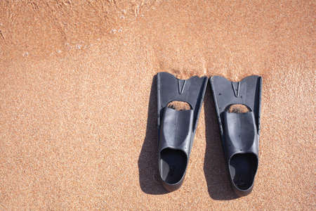 A pair of black flippers on the background of sand next to the water, top view. Swimming equipment - fins on the shore. Summer holidays, fun, exploring the sea world concept. Space for copy.