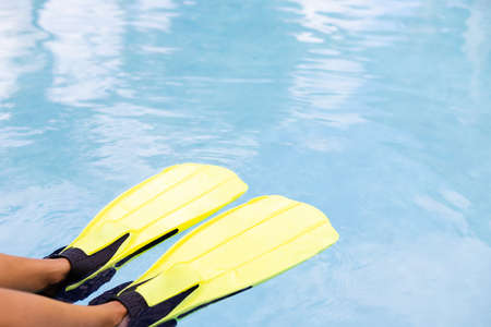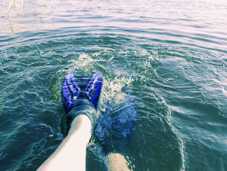 Legs in flippers fall into the blue water in the sun on a hot summer day