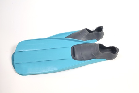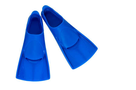 Blue flippers on a white background. Baner Flat lay. Copy space