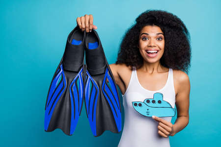Close-up portrait of her she nice attractive lovely charming cheerful cheery wavy-haired girl holding in hands ship paper form flippers isolated on bright vivid shine vibrant blue color background