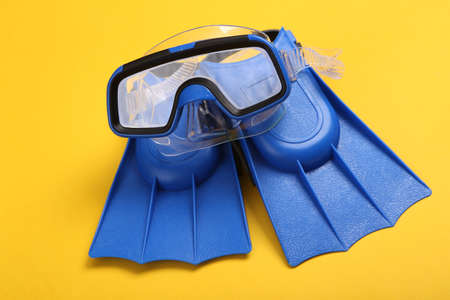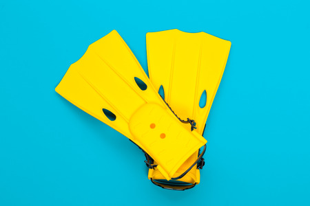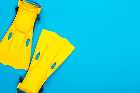 Blue flippers, swimming circle on a yellow background. Flat lay. Copy space