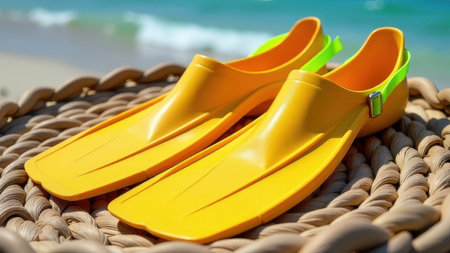 flippers on a sandy beach, blue sky and sea in the background, traveland holiday time