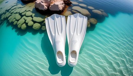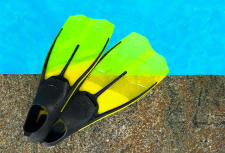 Mask and flippers in a swimming pool. Swim items (Masks and fins)