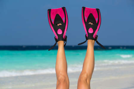 Woman relaxing on summer beach vacation holidays lying in sand. Flippers in legs. Diver fins
