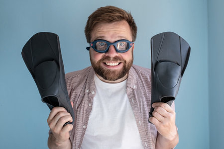 Satisfied, smiling man in anticipation of a vacation, he put on swimming goggles and holds flippers in hands, standing indoors.