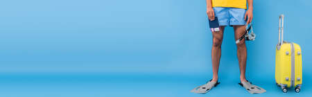 Cropped view of man in swimming flippers holding goggles and passports near suitcase on blue background, banner