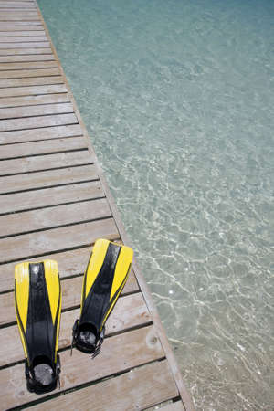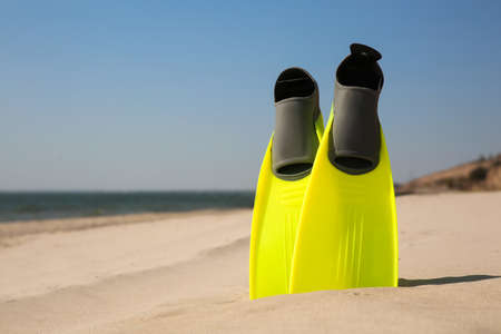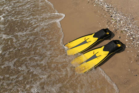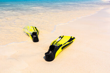 yellow swimming flippers with mask and tube on sand beach by the clear sea