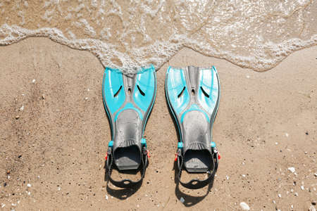 Pair of teal flippers on sandy sea or ocean beach, side view. Swimming equipment - fins on shore. Summer vacation, fun, exploration of marine world concept