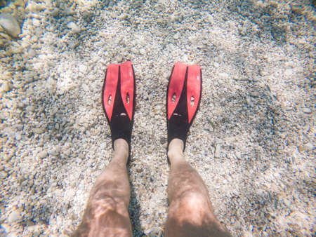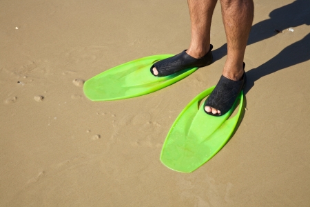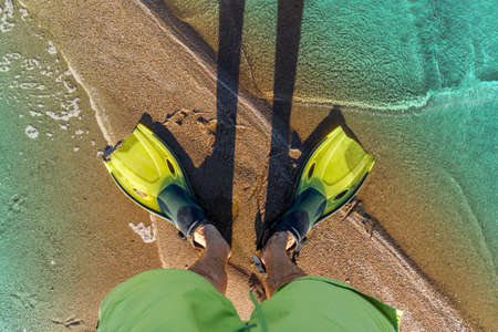 Male legs in flippers on a sandy beach by the sea. Top view. Diving training concept