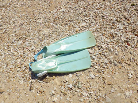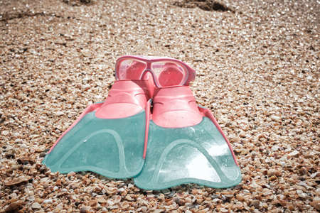 A snorkeling mask and baby flippers on the beach sand. High quality photo